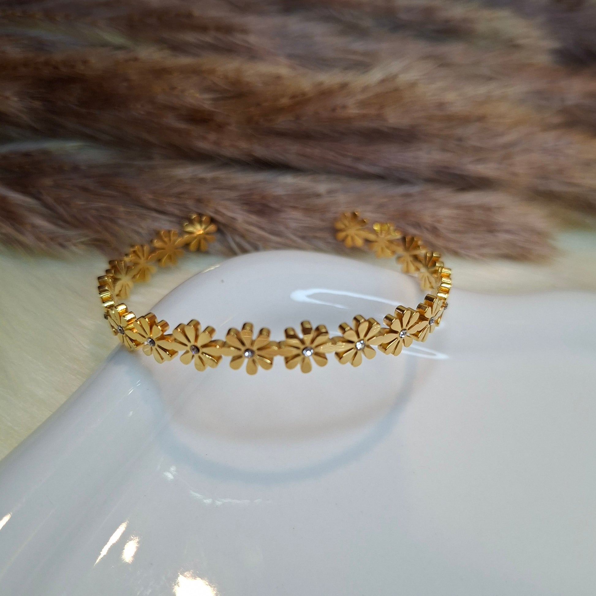 Delicately adorned with shimmering zircons and soft pearls, the Florina Bangle brings a touch of elegance and charm to any occasion.